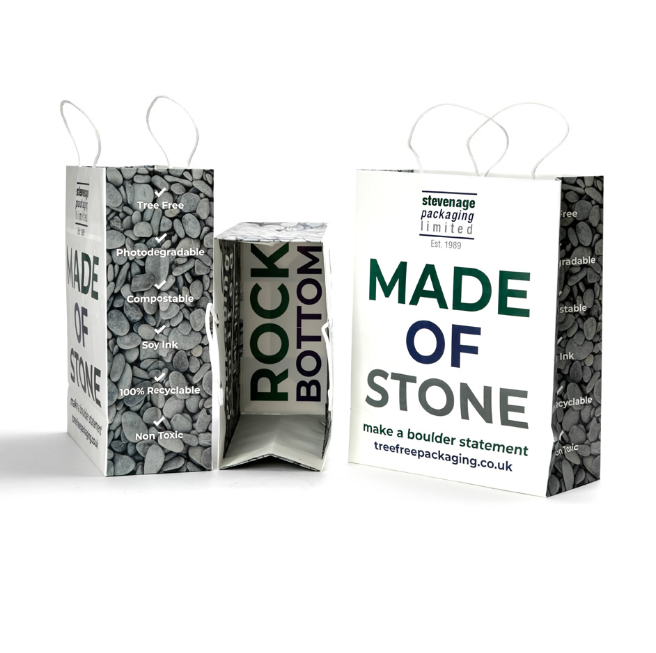 Stone paper bags are a revolutionary new type of paper bag, much more efficiently produced than a standard paper bag. Less waste is produced in their manufacturing, and they’re sturdier than a traditional paper bag, which is incredibly valuable for retailers.