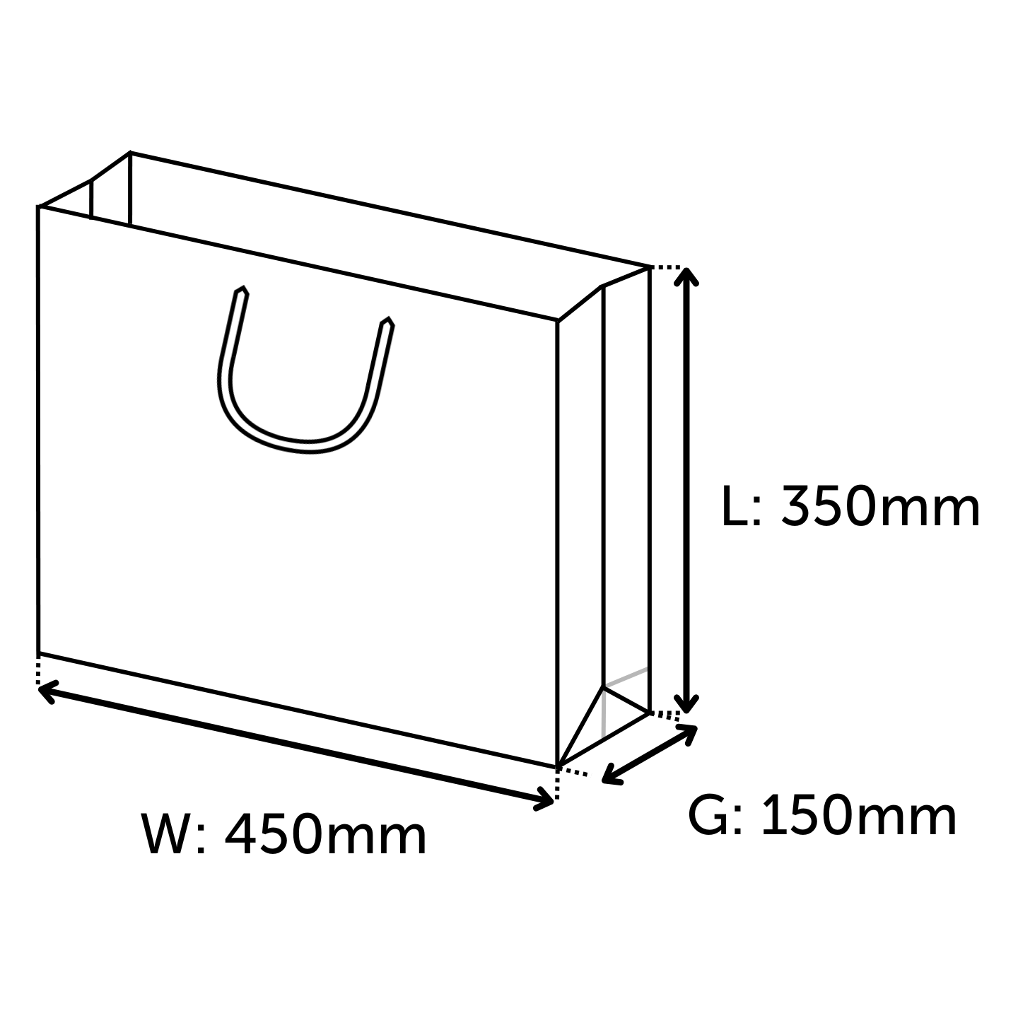 The largest twisted handle paper bag size in landscape orientation. This bag is over half a metre in width, and just shy of half a metre in length. These bags are perfect for home stores, great for bed pillows, blankets and anything that requires a much larger bag.